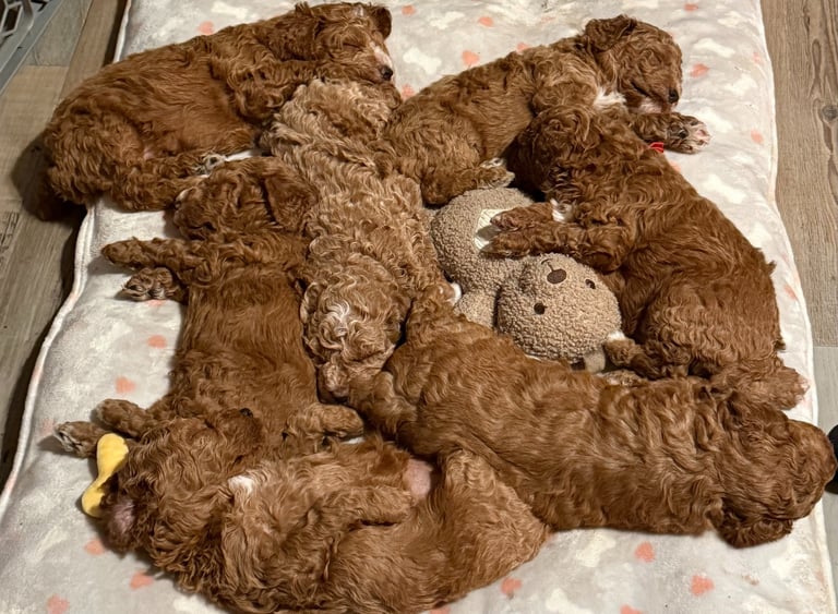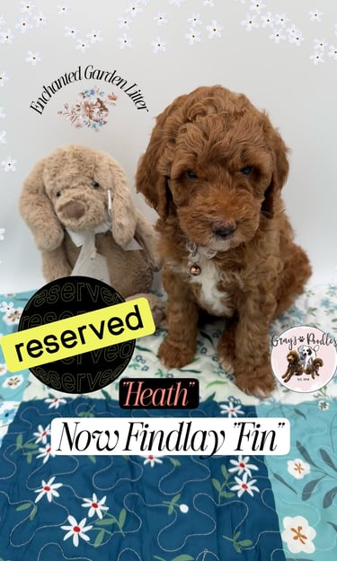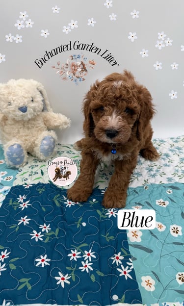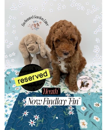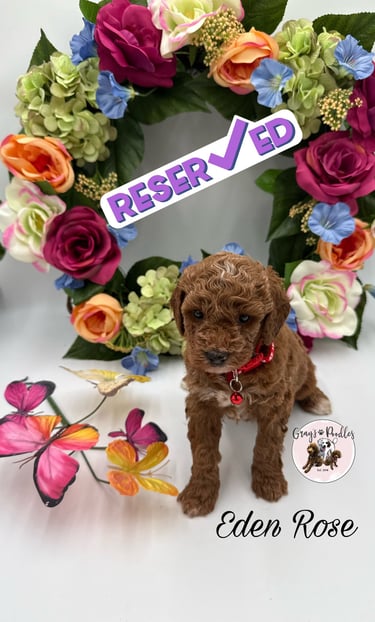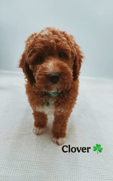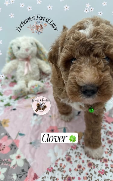 Frosted apricot with beautifully distinct white paws, Clover stands out like a rare bloom in the garden. True to her lucky name, she arrived as the surprise seventh and has been capturing hearts ever since. At four weeks, she is already expressive and engaging β her little βsmilesβ and bright presence hint at a charming, people-loving personality that draws others in effortlessly.